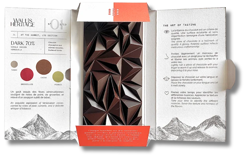 A l’image d’un alpiniste gravissant les cimes pour goûter l’infini, ce chocolat vous invite à partir à la conquête du sublime.
