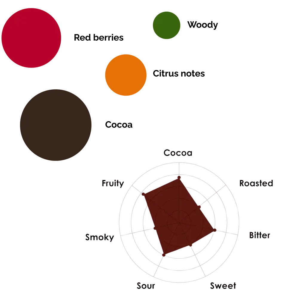 Profil intense et équilibré, marqué par une acidité rafraîchissante de fruits rouges, rehaussée de subtiles notes d’agrumes. Finale boisée.