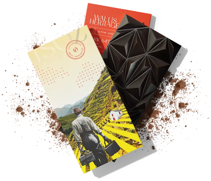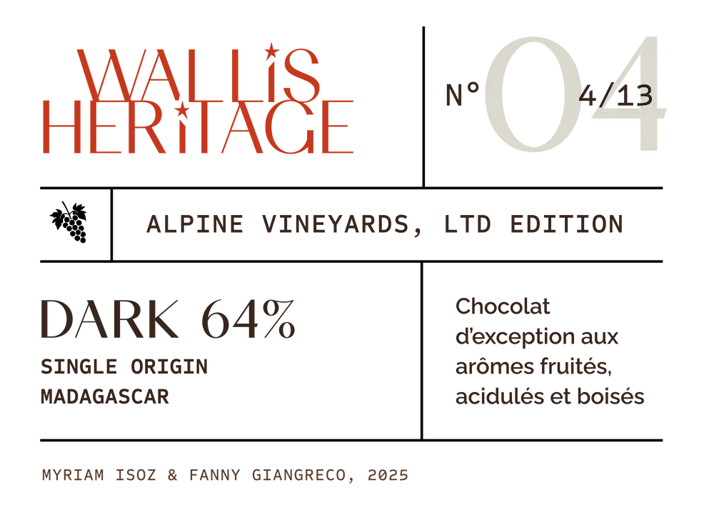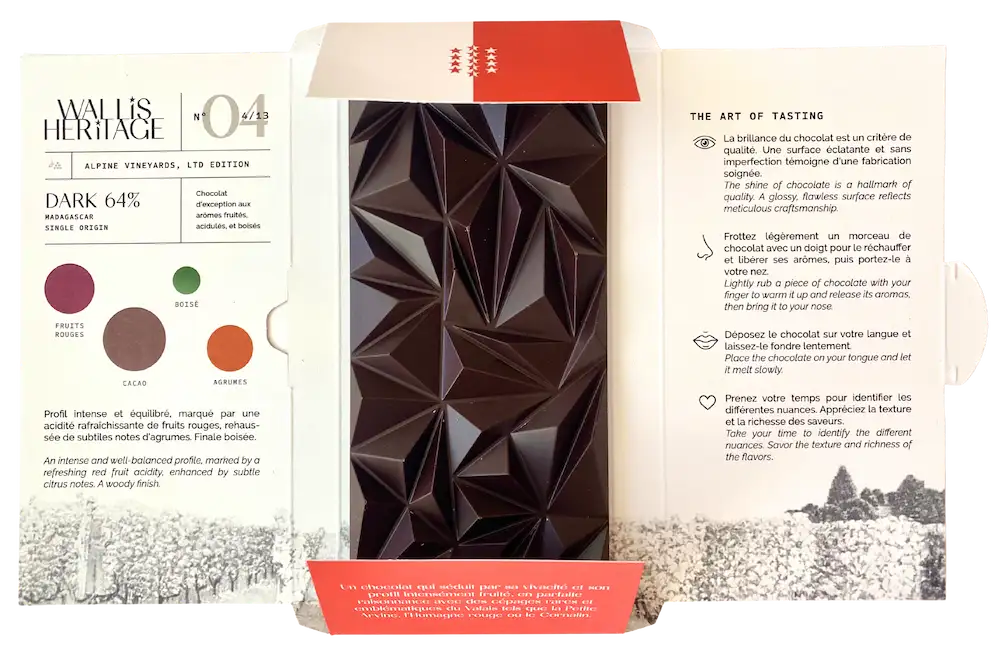 Un chocolat qui séduit par sa vivacité et son profil intensément fruité, en parfaite raisonnance avec des cépages rares et emblématiques du Valais tels que la Petite Arvine, l’Humagne rouge ou le Cornalin.