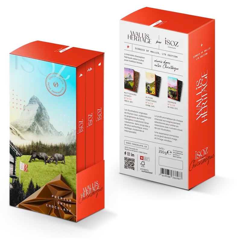 Savourez le Valais dans toute sa diversité grâce à ce coffret de dégustation réunissant trois tablettes de chocolat d’exception présentées dans un fourreau inspiré par l’univers littéraire.